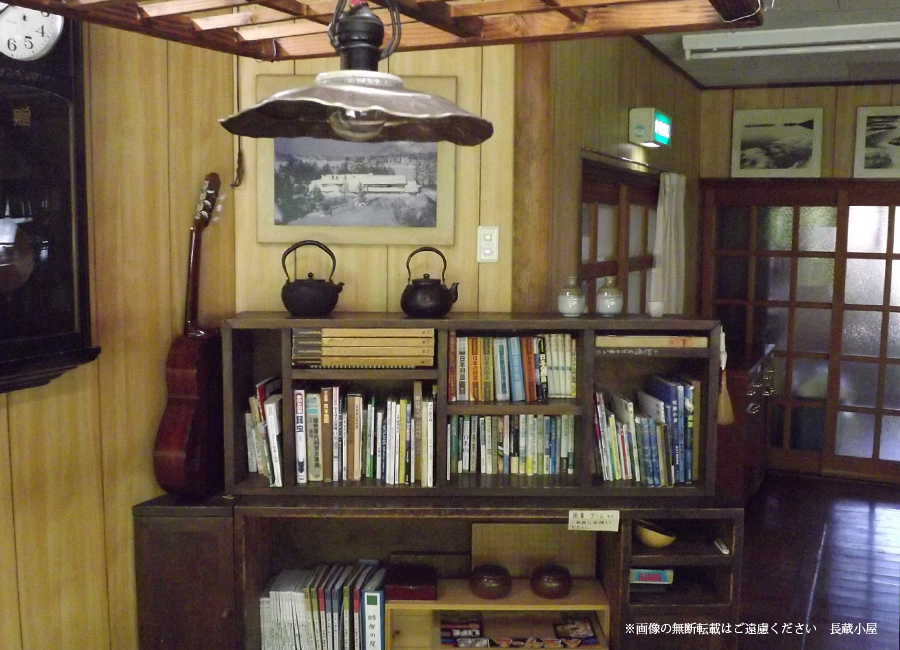 食堂脇の炉端コーナーには、尾瀬の本や図鑑、ゲームなどのご用意がございます。夕食後は食堂を開放しており、ゆったりと食後のひとときを過ごせます。 ※第二長蔵小屋は自家発電のため、夜9時で自動的に客室の電気が消えます